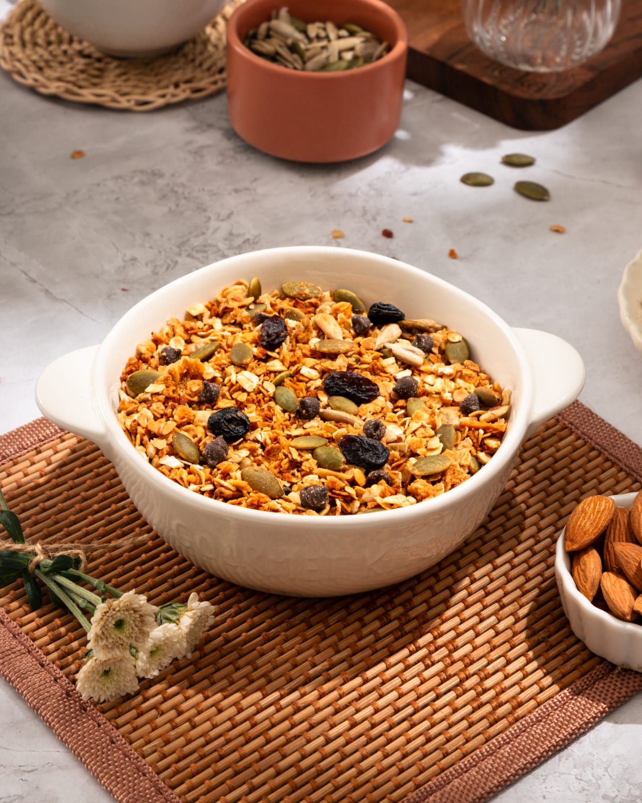 A wholesome blend of oats, nuts, seeds, and a touch of honey—perfectly balanced with the rich bursts of black raisins and choco chips.
